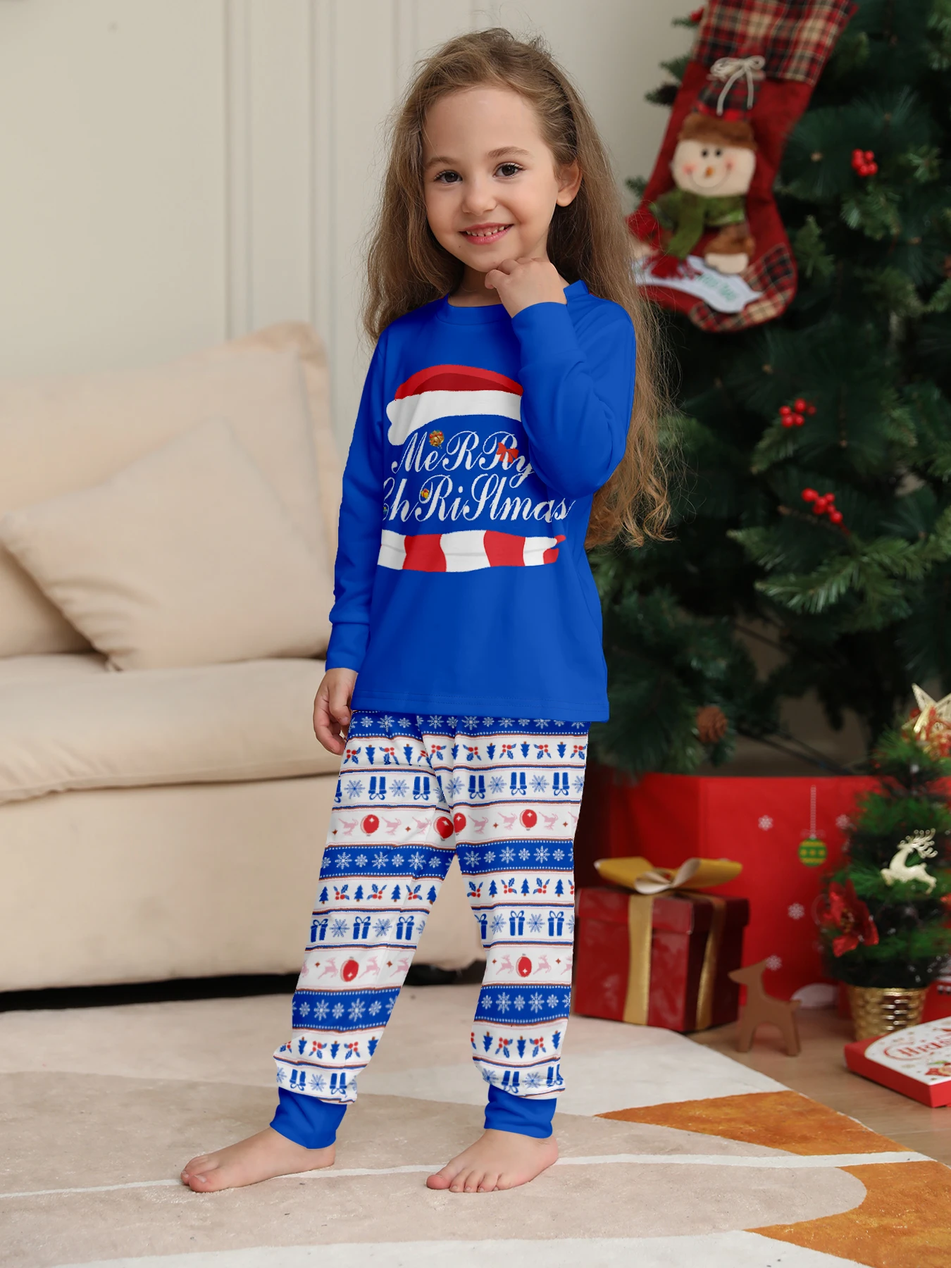 Embrace the holiday spirit with our blue Santa hat and 'Merry Christmas' top, perfect for a festive family photo.