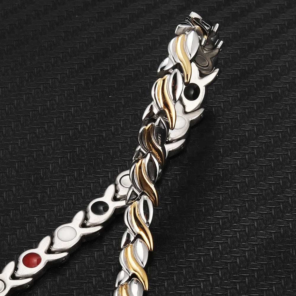 Bem-estar e elegância! Pulseira de aço inoxidável com tecnologia magnética para terapia de artrite e energia.