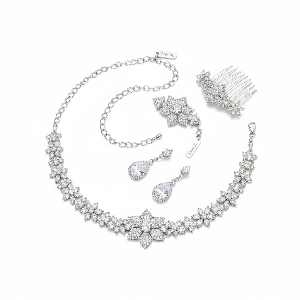 Conjunto Joias ZAKOL Luxo Zircão AAA Branco - Brincos Pulseira Colar 4 Peças para Casamento