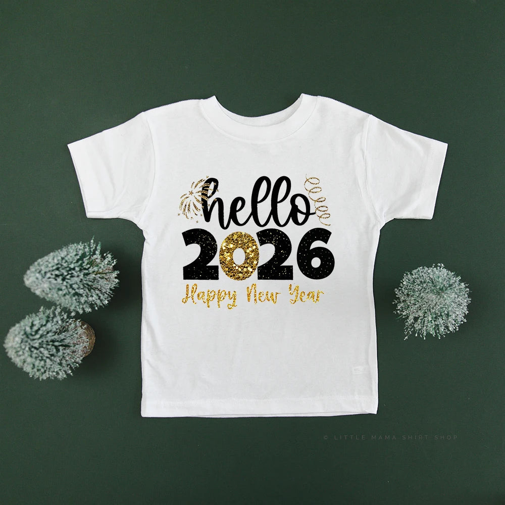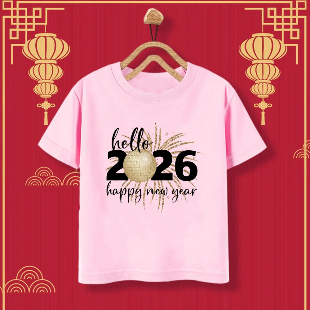 Celebra a chegada de 2026 com estilo! T-shirt premium com impressão vibrante "Hello 2026" perfeita para as festas de fim de ano e fotos de família.