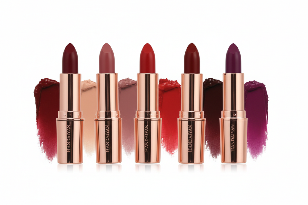Descobre o segredo de lábios impecáveis que duram o dia todo com o Kit HANDAIYAN 6 Batons Líquidos Matte. Fórmula profissional à prova de água, transferência e beijo.